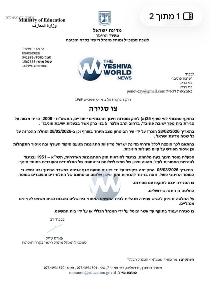 The order states: “By virtue of my authority under Section 35(a) of the Unique Cultural Educational Institutions Law, 2008, I hereby order the closure of the Ponevezh Yeshiva school located at 5 Rabbi Meltzer Street, Bnei Brak, which is owned by the Ponevezh Yeshiva.”