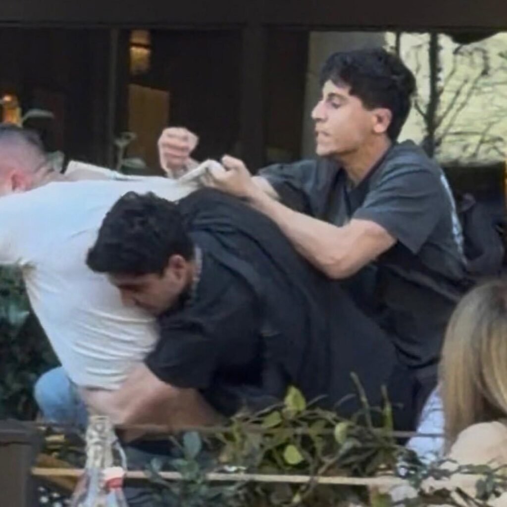 Video of the assault, which occurred around 3:38 p.m., quickly spread across social media. The footage shows three attackers repeatedly striking one of the victims on the ground under navy-blue patio umbrellas outside the restaurant while stunned diners and pedestrians look on.