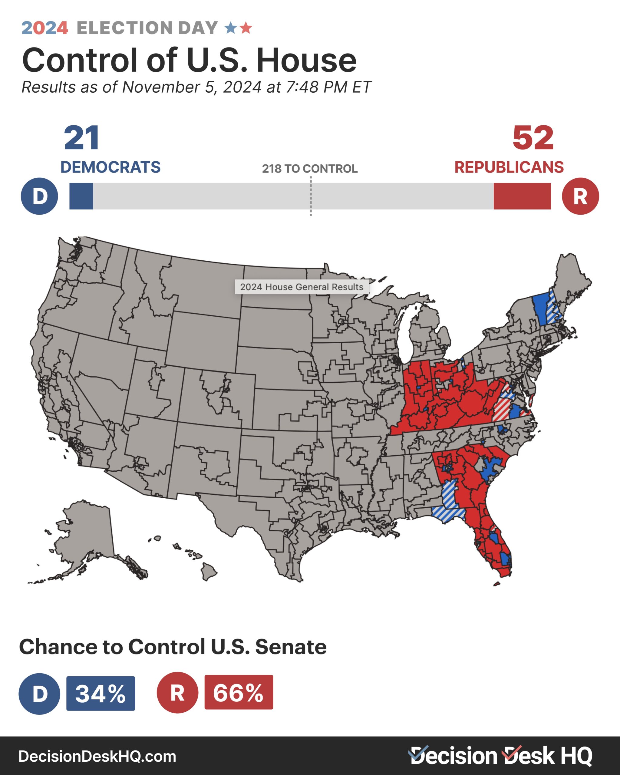 As of 7:48 PM, Republicans have a 66% chance of retaining control of the House.
