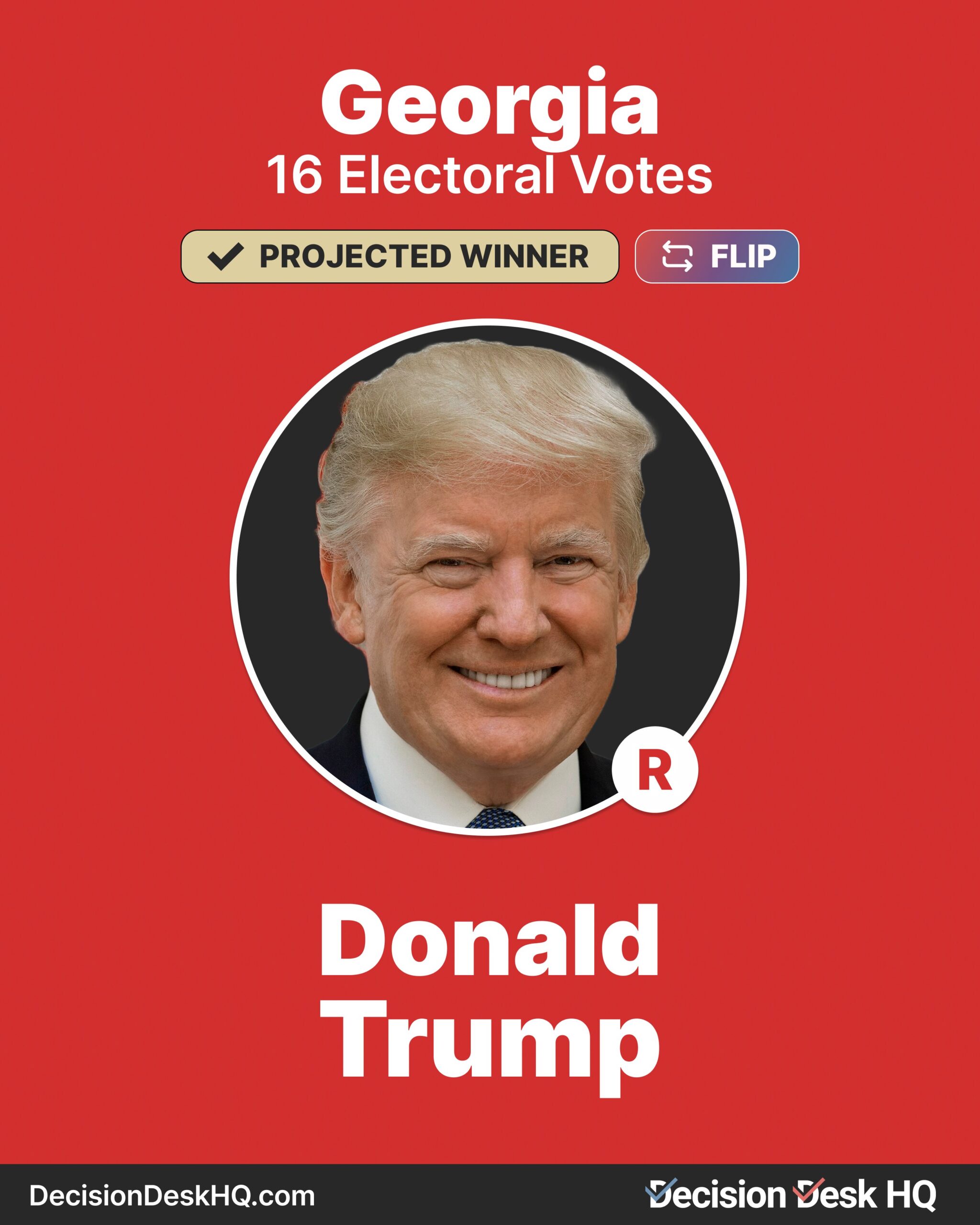 BREAKING: Donald Trump wins the critical swing state of Georgia, picking up 16 more EC votes. He now has 243 – within striking distance of the 270 needed to win the presidency.