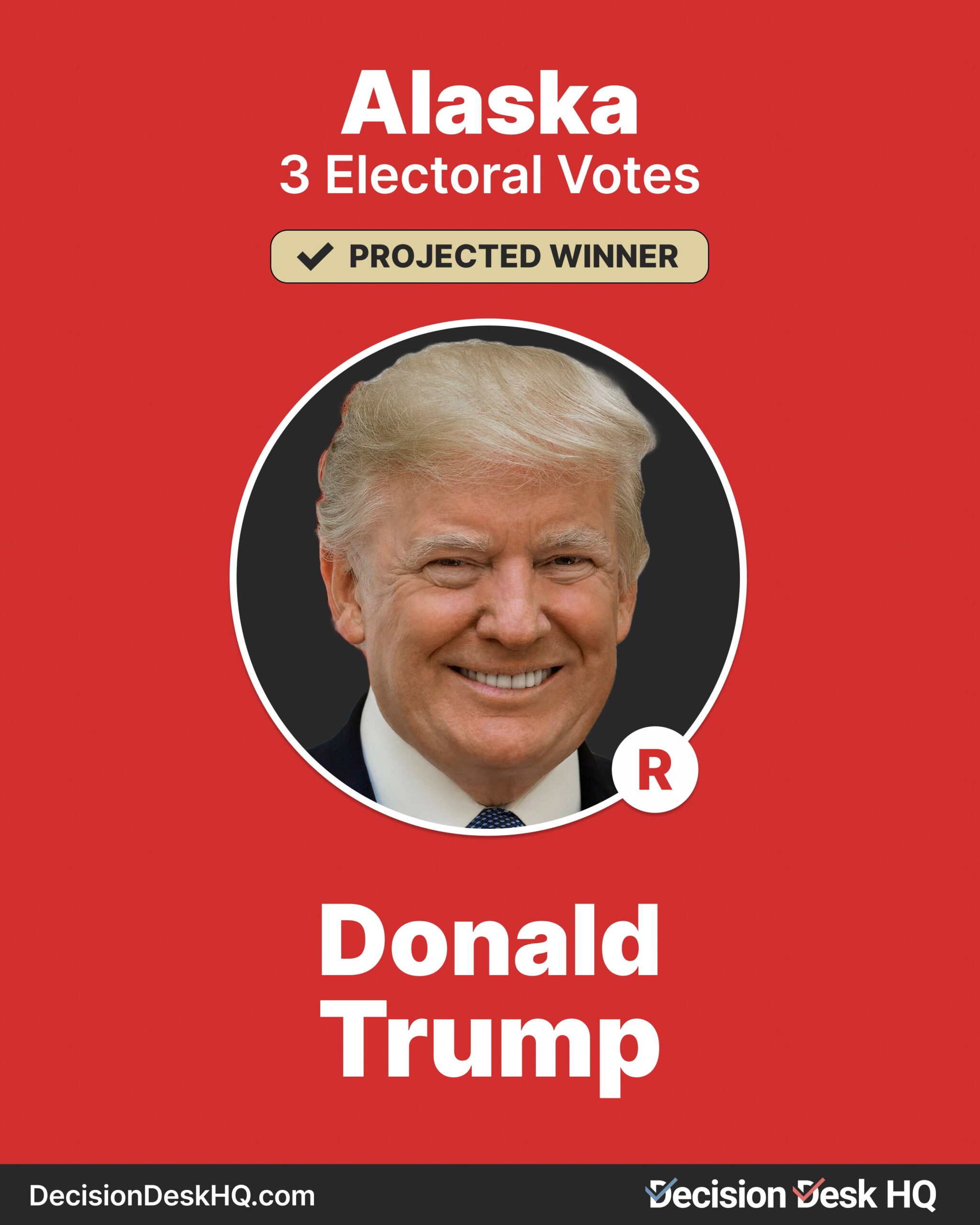 Donald Trump wins Alaska. Trump now only needs to win 2 of the remaining swing states – Pennsylvania, Wisconsin, Michigan, and Arizona – to cross the 270 Electoral Vote threshold and secure the presidency