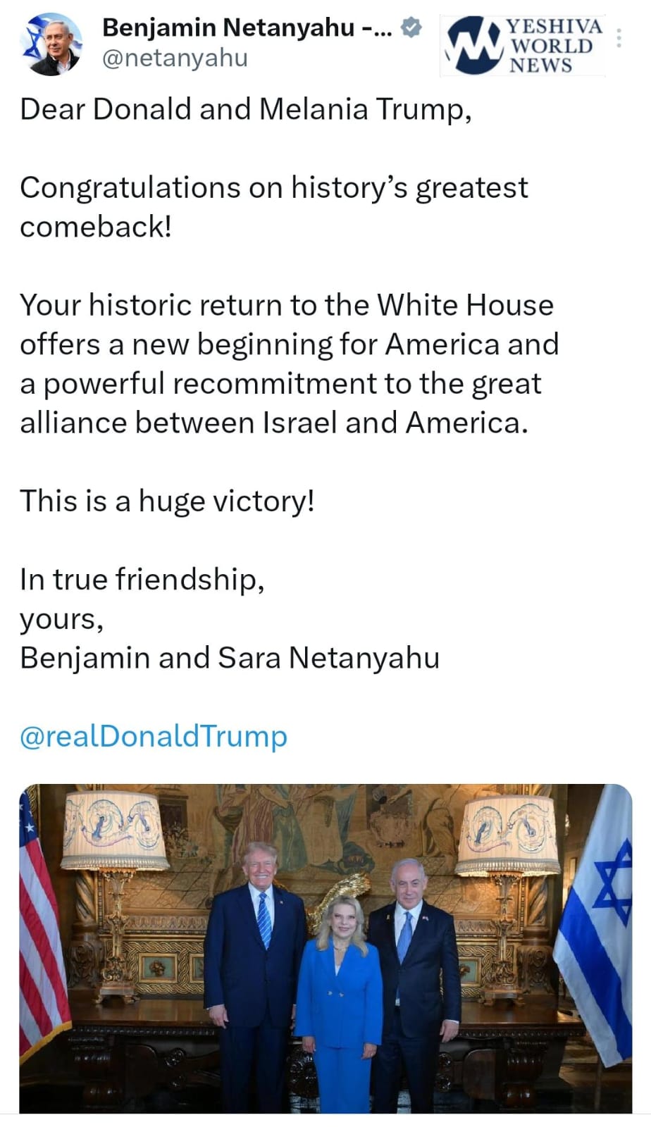 Prime Minister Netanyahu and his wife Sara congratulate President Trump on his victory tonight.