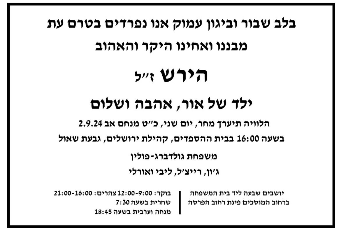 The Levaya of Hersh Goldberg-Polin HY’D will take place on Monday, September 2, at 4:00 p.m. (Israel time) at the Har Hamenuchos cemetery in Yerushalyim.