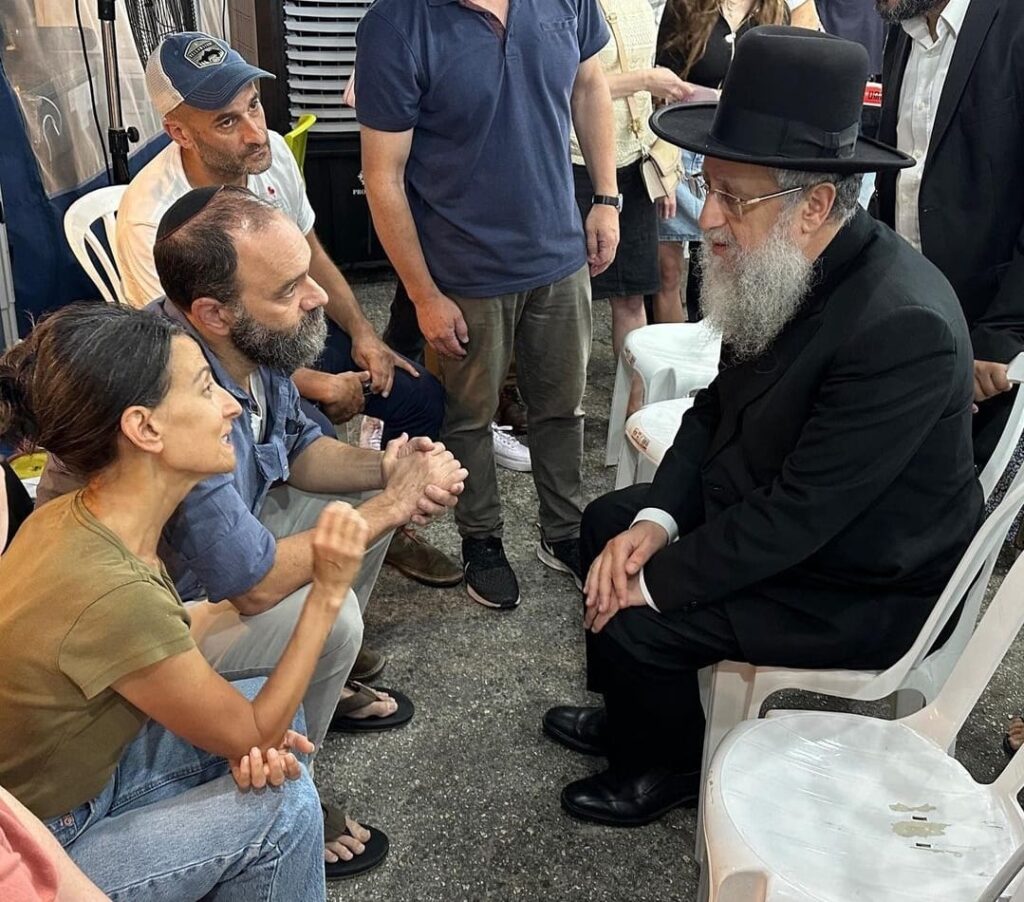 Rav Dovid Yosef speaks to the parents of murdered hostage Hersh Goldberg-Polin as they sit Shiva.