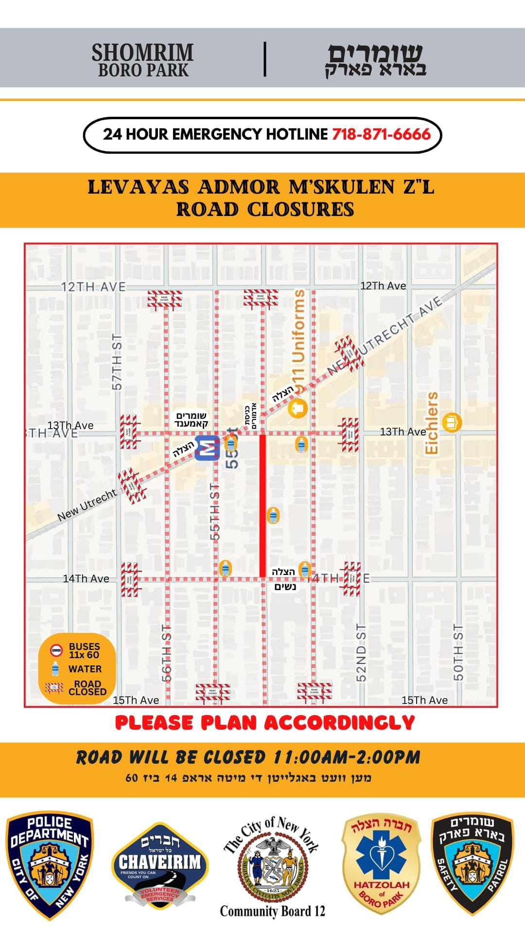 Road Closures due to the Levaya of the Skulener Rebbe HaRav Yeshaya Yaakov Portugal ZT”L scheduled for Sunday at 12PM.
