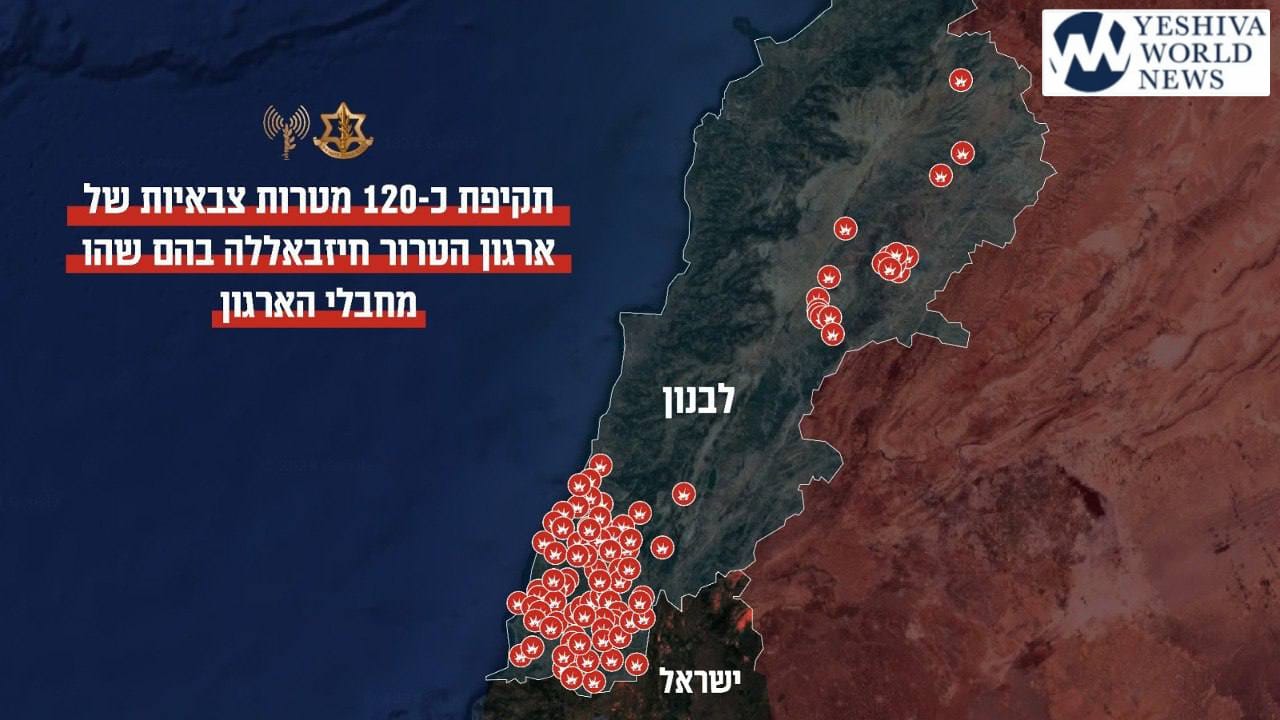 The IDF announces that a short while ago, the IAF conducted a staggering 120 airstrikes on Hezbollah terror targets where Hezbollah operatives were located in southern Lebanon and deep inside Lebanese territory