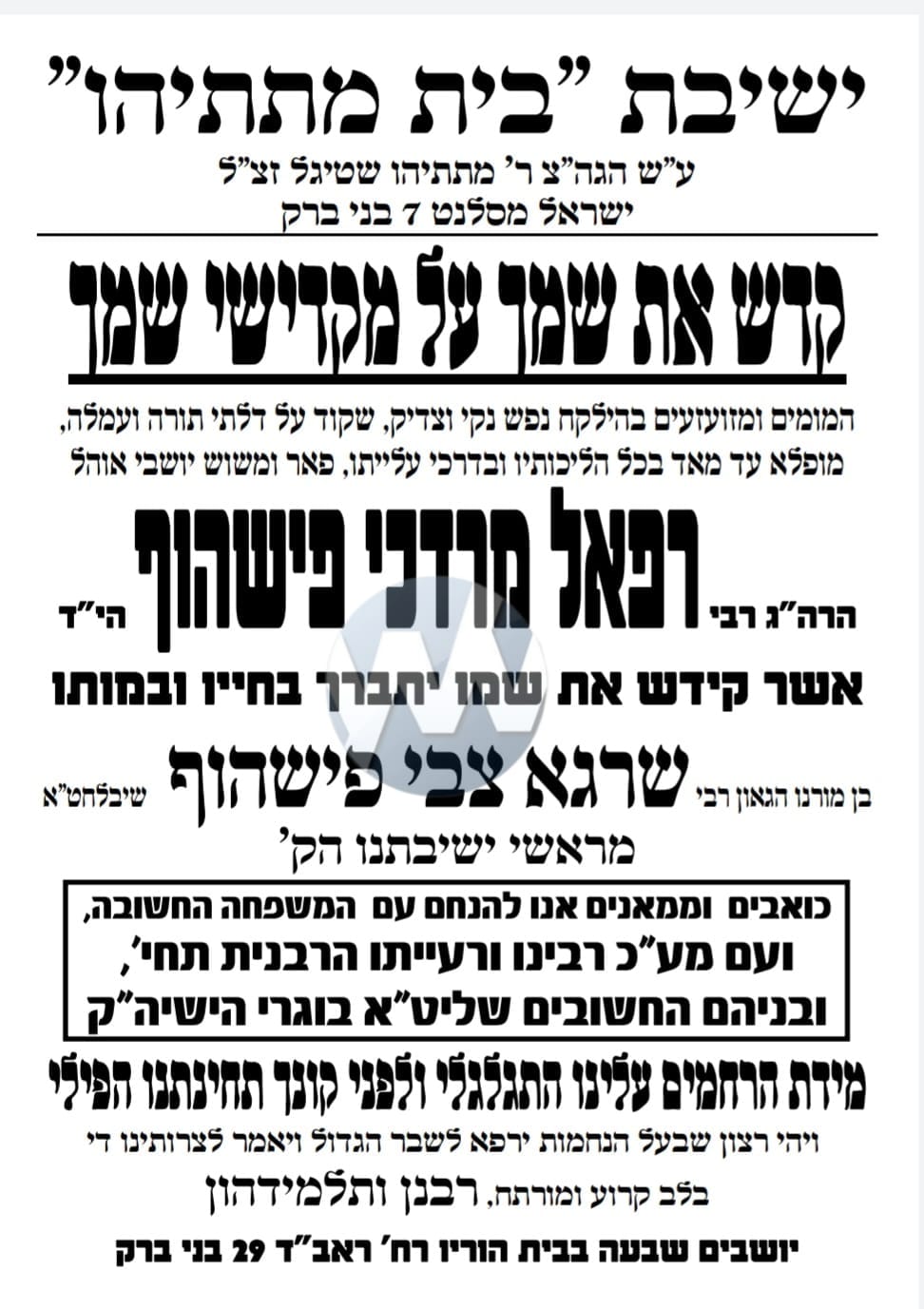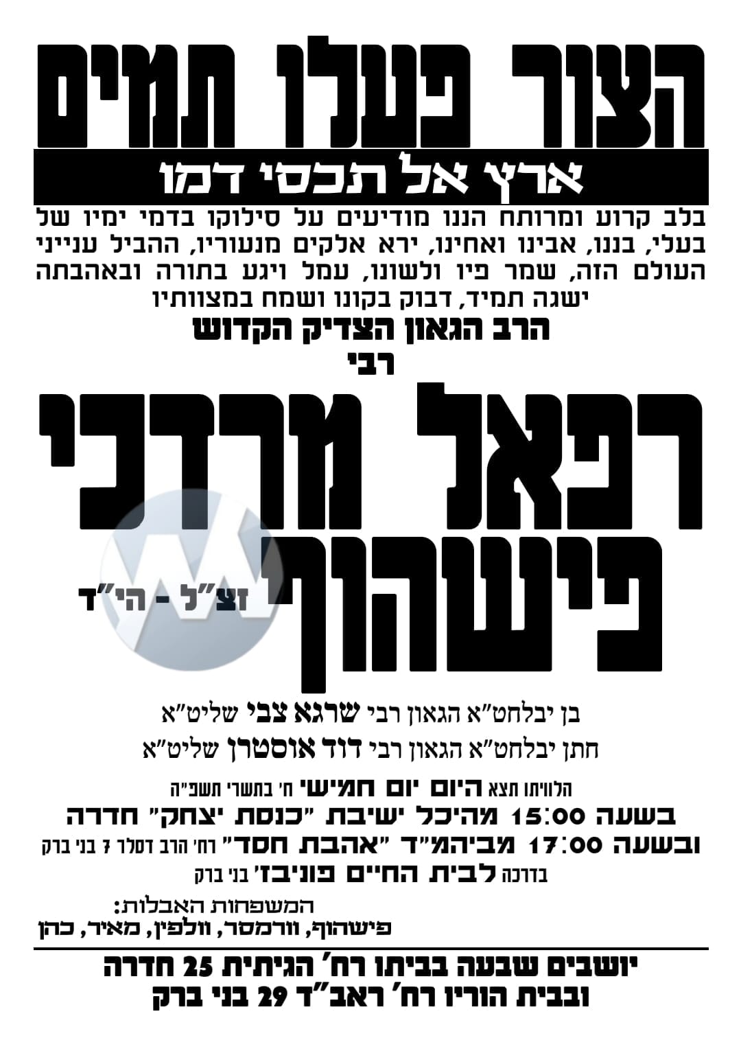 Thousands are currently at the Levaya in Bnei Brak of HaRav Rafael Mordechai Fishoff, H”yd, the Avreich who was brutally murdered by a heinous terrorist in Hadera on Wednesday.