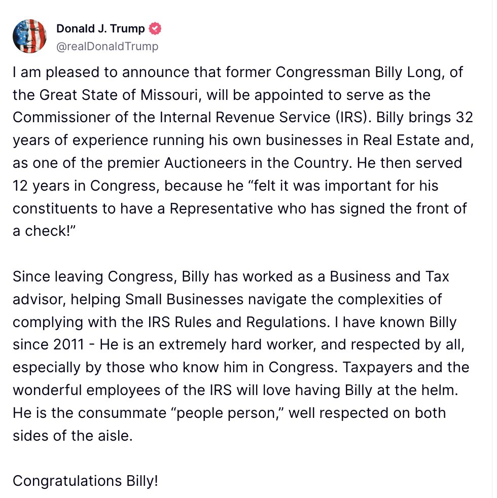President Trump announced the nomination of former Congressman Billy Long to Commissioner of the IRS.