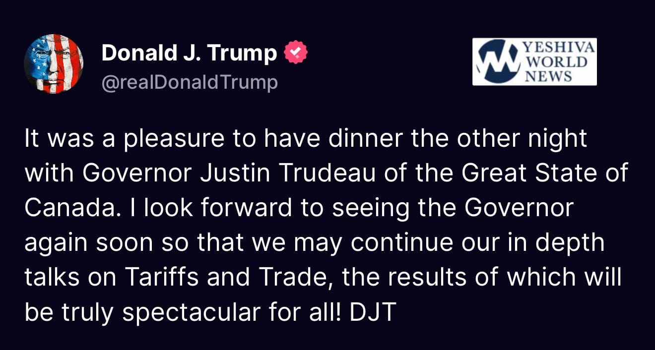 Trump posts late-night trolling message on social media calling Canadian PM Trudeau, the “Governor of the Great State of Canada.”