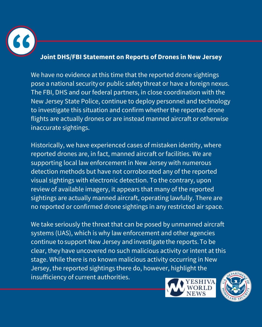 FBI and DHS Issue Joint Statement on Drone Sightings in New Jersey
