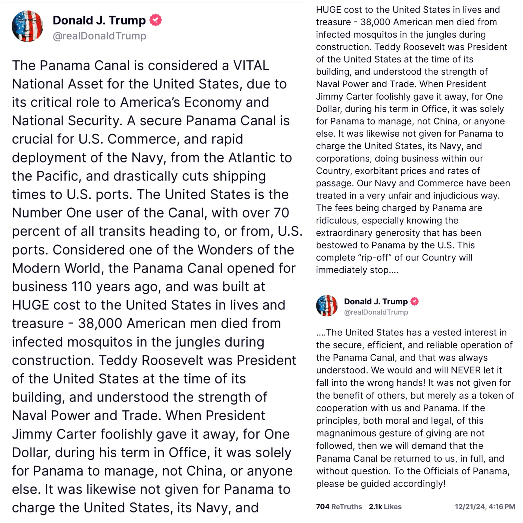 Donald Trump says he may demand that the Panama Canal be returned to the United States.