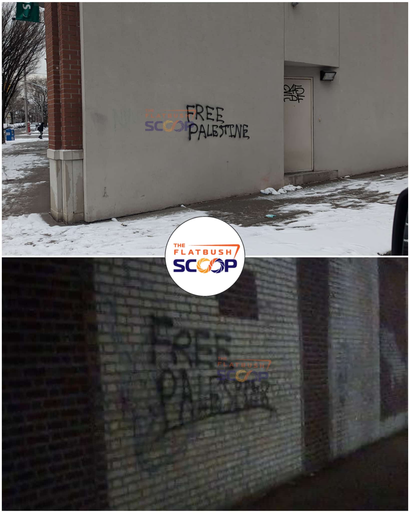 Graffiti reading “Free Palestine” was found in multiple Flatbush locations overnight, including the Citizens Bank building at Chestnut and East 15th and a property at 1016 East 13th Street near Avenue J. Authorities are investigating the incidents.