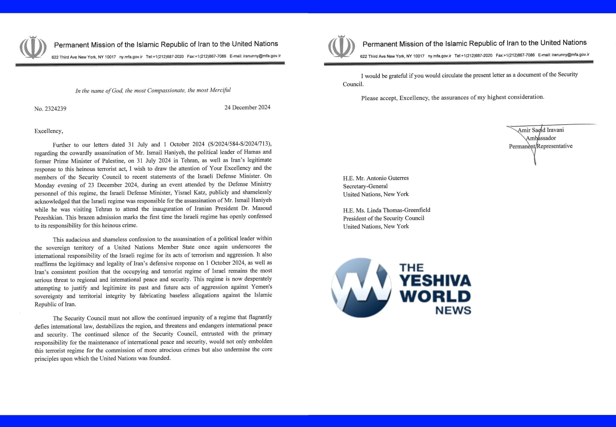 After Israel confirmed it was responsible for the July assassination of Hamas leader Ismail Haniyeh in Tehran, Iran sent a letter to the UN secretary-general demanding condemnation of the act and asserting it justified Iran’s October ballistic missile strike on Israel.