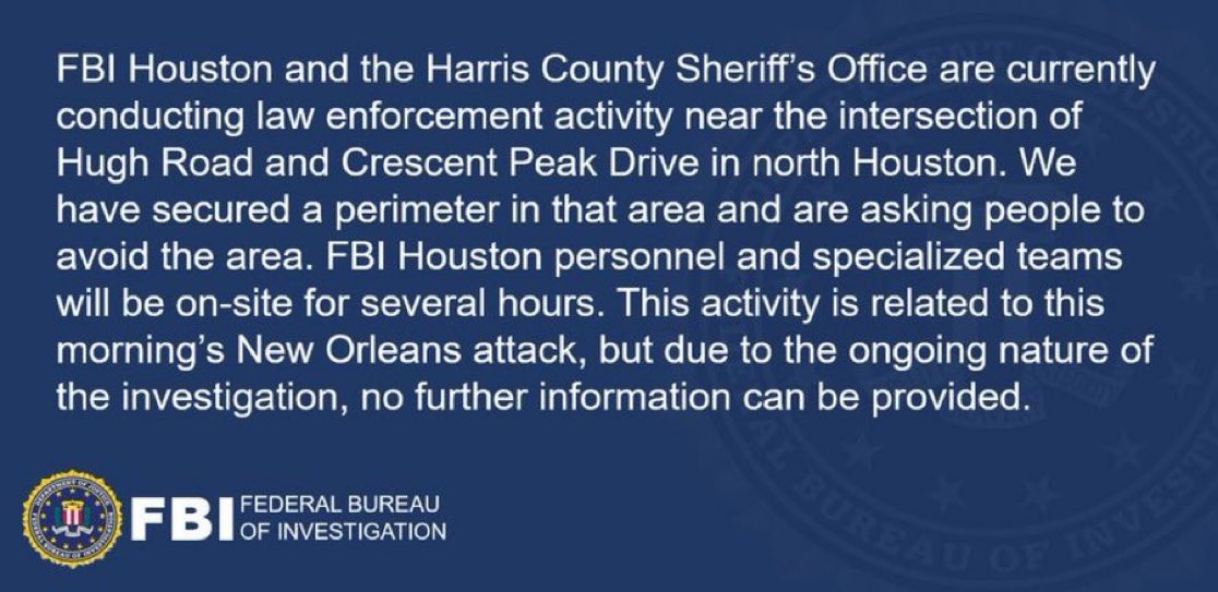 “This activity is related to this morning’s New Orleans attack, but due to the ongoing nature of the investigation, no further information can be provided.”