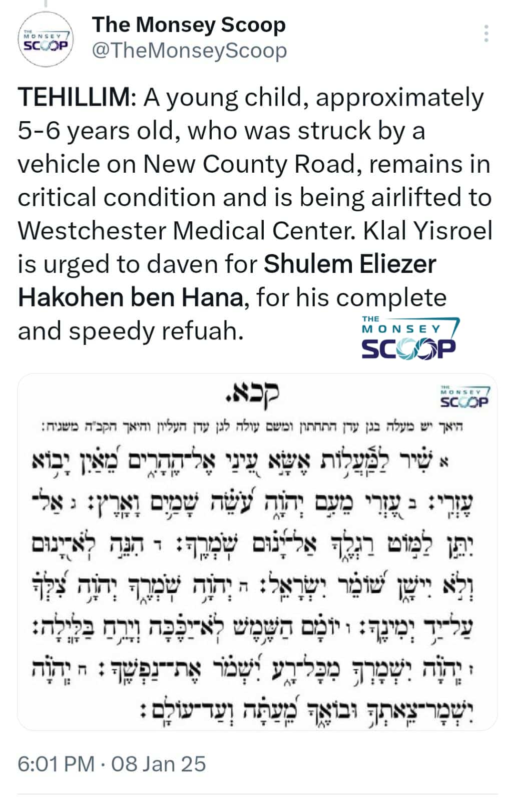 A child was hit by a vehicle on New County Road near Route 59 on Wednesday afternoon and was transported to Good Samaritan Hospital by Rockland Hatzoloh Paramedics.