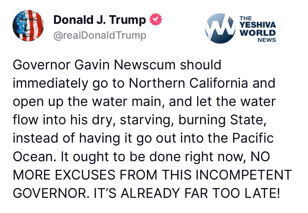 The issue is not the water supply. We have plenty of water. The issue is distribution. It’s hard to get the water to the fire. Trump works never say this stuff is it was happening in Texas or Florida. He’s scoring cheap political points while thousands are suffering. The man is evil.