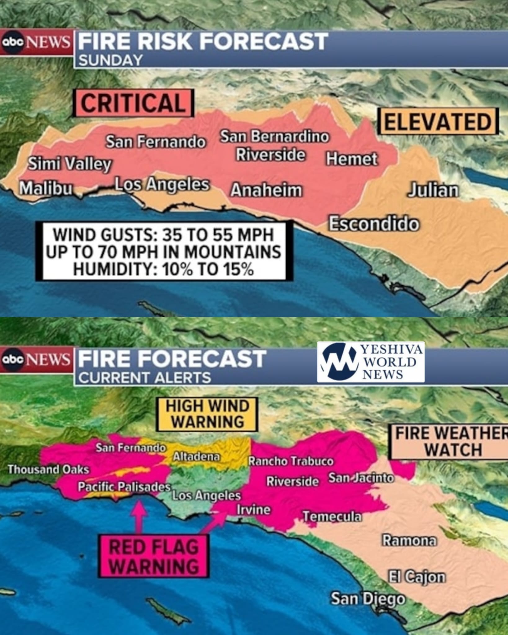 Winds overnight reached 35-55 mph, with mountain gusts as high as 70 mph around Los Angeles. A red flag warning remains in place through Wednesday, with humidity dropping to 10% and powerful Santa Ana winds continuing.