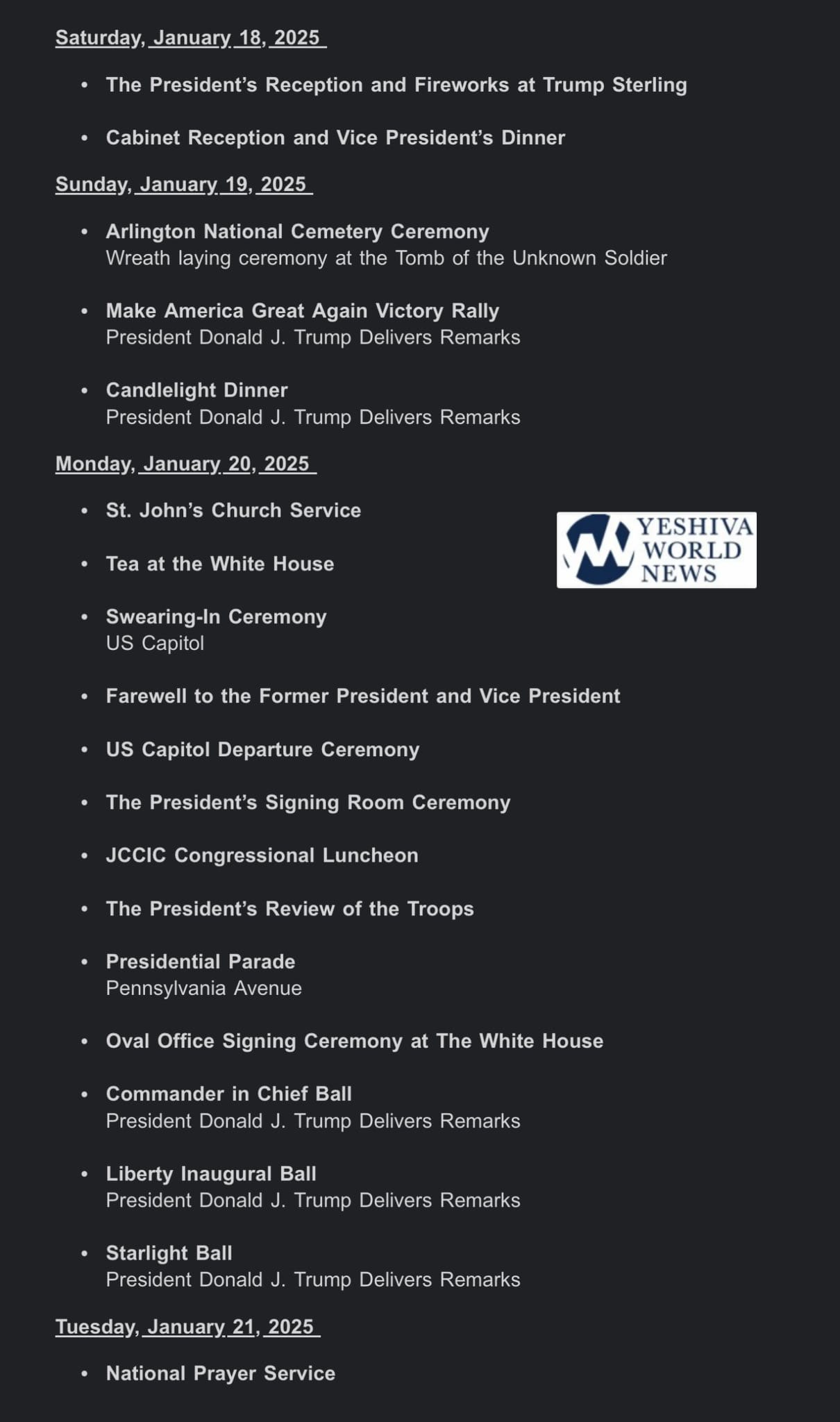 Trump team has announced its multi-day inaugural celebration schedule. The Victory Rally is on Sunday, and Inauguration Day has a packed schedule.