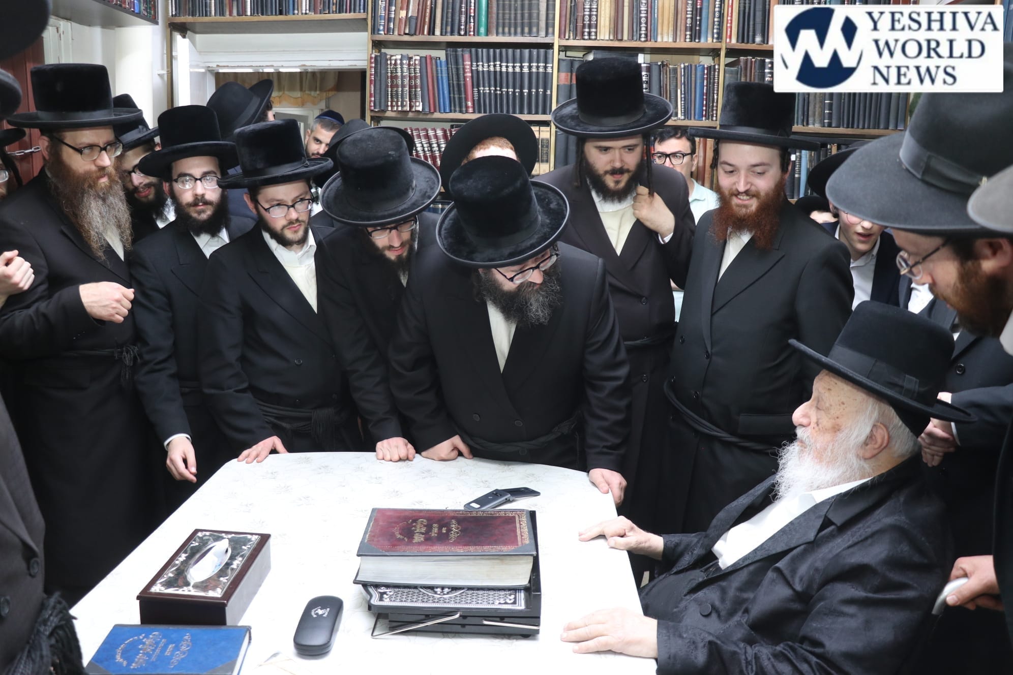 Choshen Mishpat Kollel of Skverer Yungerleit on a visit to Eretz Yisroel being tested by the Ponevezh Rosh Yeshiva, Hagaon HaRav Berel Povarsky.