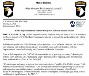 The 101st Airborne Division from Fort Campbell, Kentucky, has declared that the 716th Military Police Battalion will deploy to the U.S.-Mexico border to support existing military forces and Customs and Border Protection.