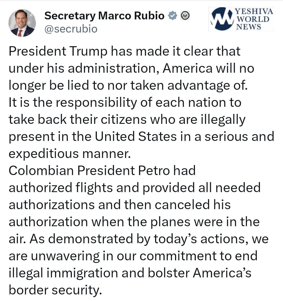 This is what Secretary of State Marco Rubio had to say about the Columbian president refusing US Military aircraft to land with criminal migrants deported from the United States.