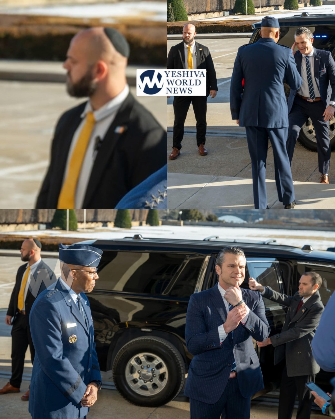 Defense Secretary Pete Hegseth arrived at the Pentagon, Monday, Jan. 27, 2025 in Washington. Photos by the AP (licensed to YWN) show what appears to be a Frum Secret Service member.