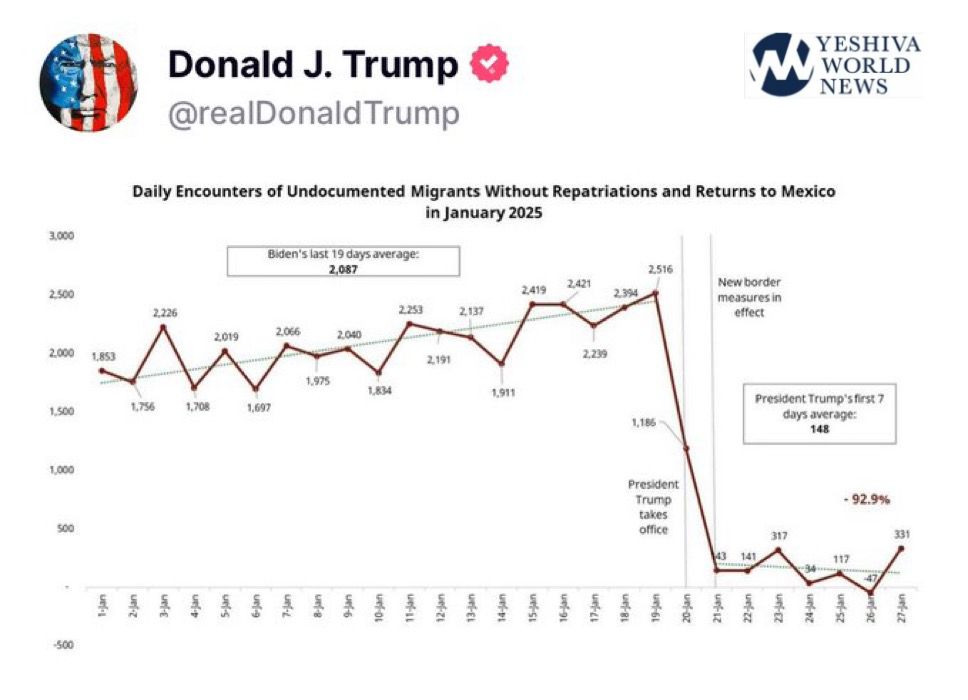 The average number of daily encounters with illegal migrants dropped dramatically from 2,087 during the last 19 days of Biden’s term to only 148 in the first 7 days of Trump’s presidency.