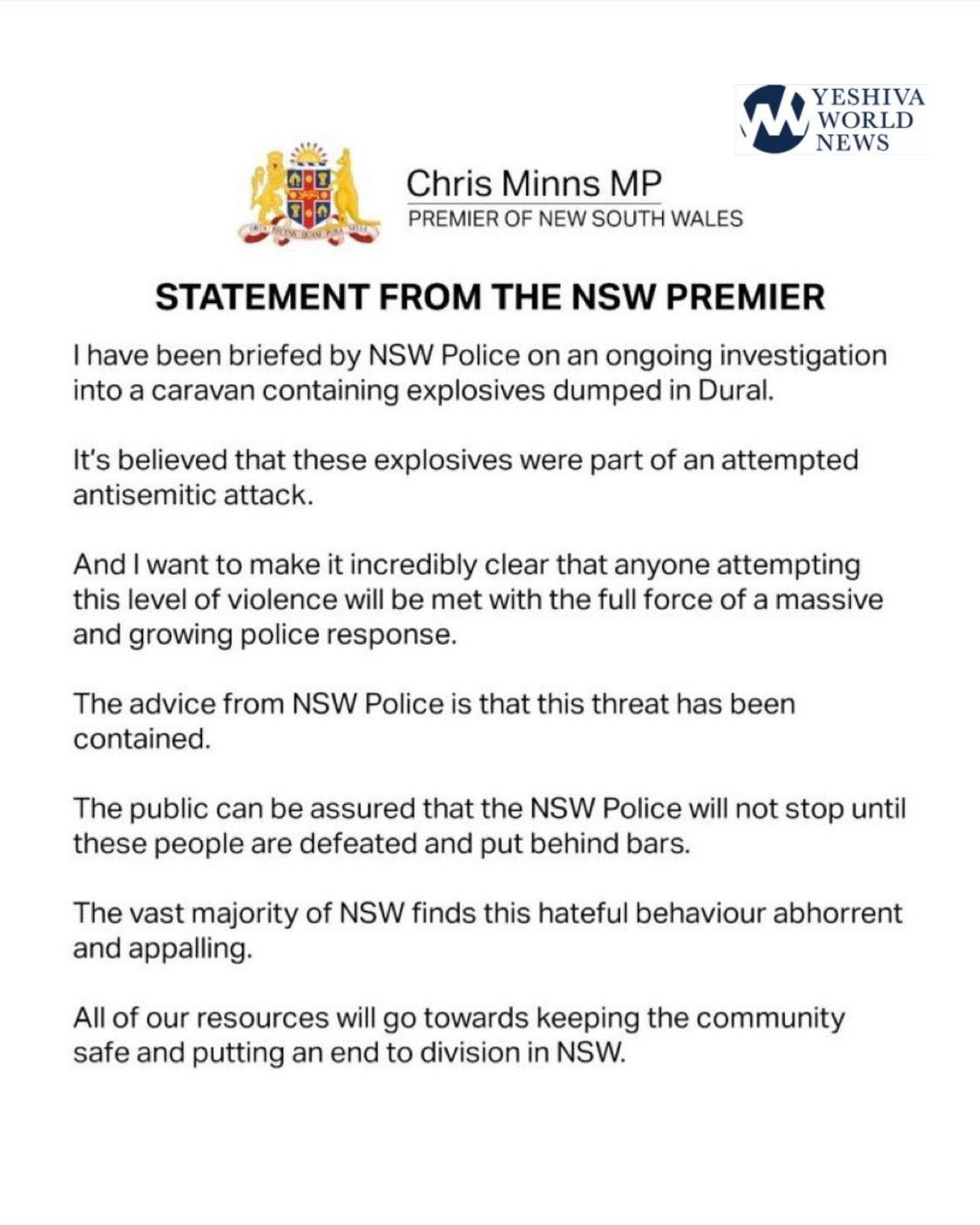 The Australian police revealed that they intercepted a truck loaded with explosives, which was planned to attack Jewish institutions.