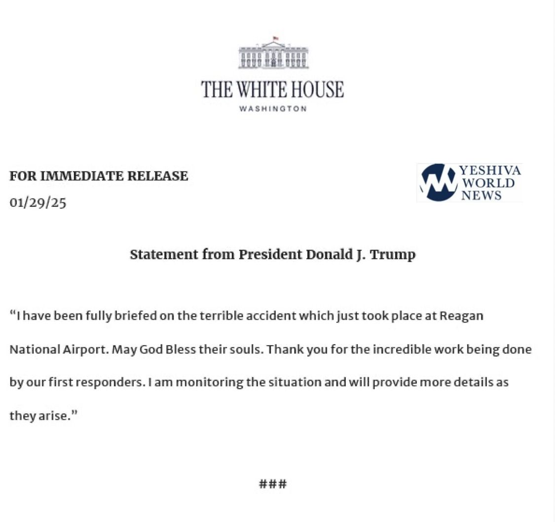 President Trump releases statement regarding the horrific plane crash in Washington D.C.