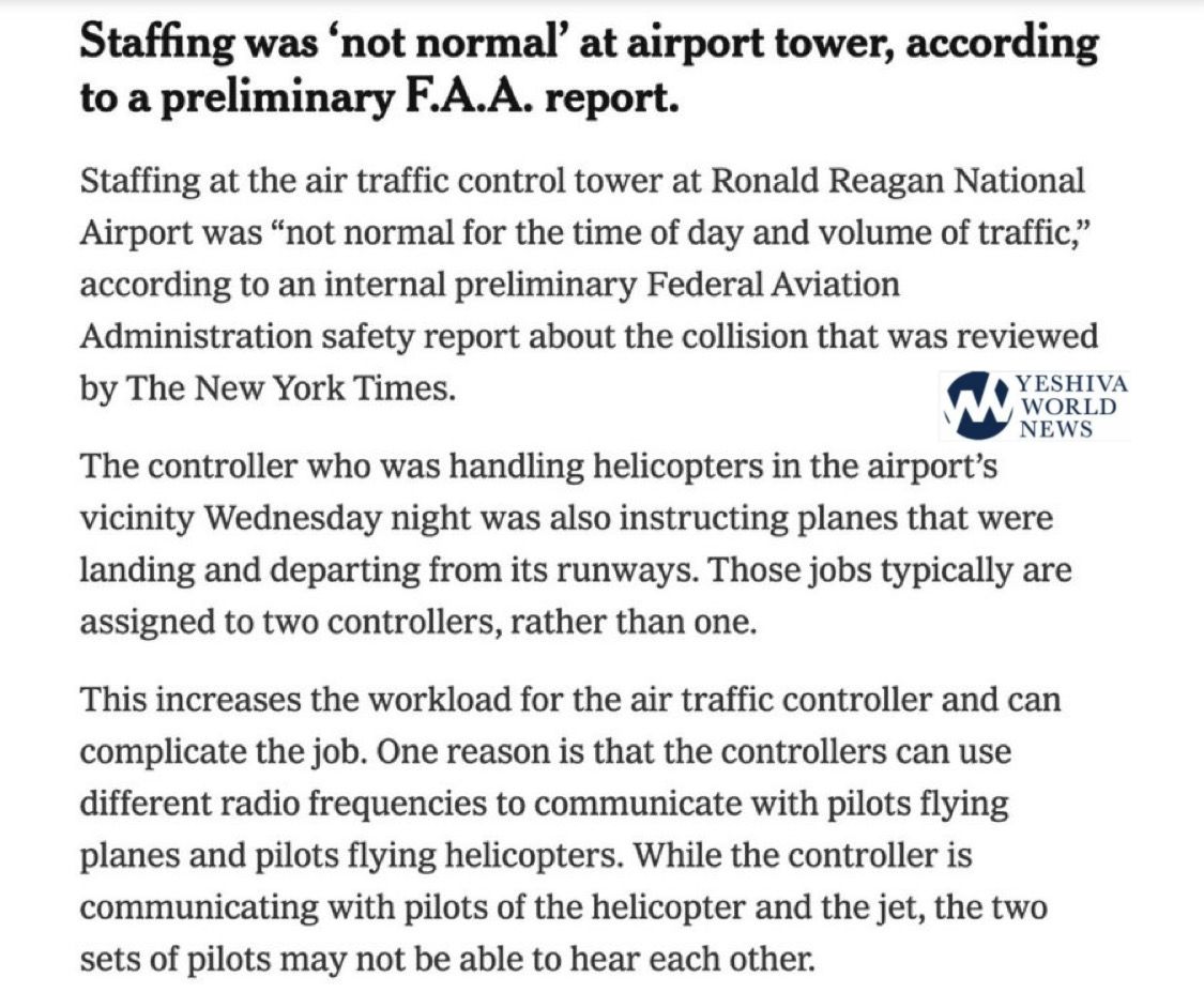 Initial FAA report on the collision indicates that staffing at the airport control tower was not at normal levels.