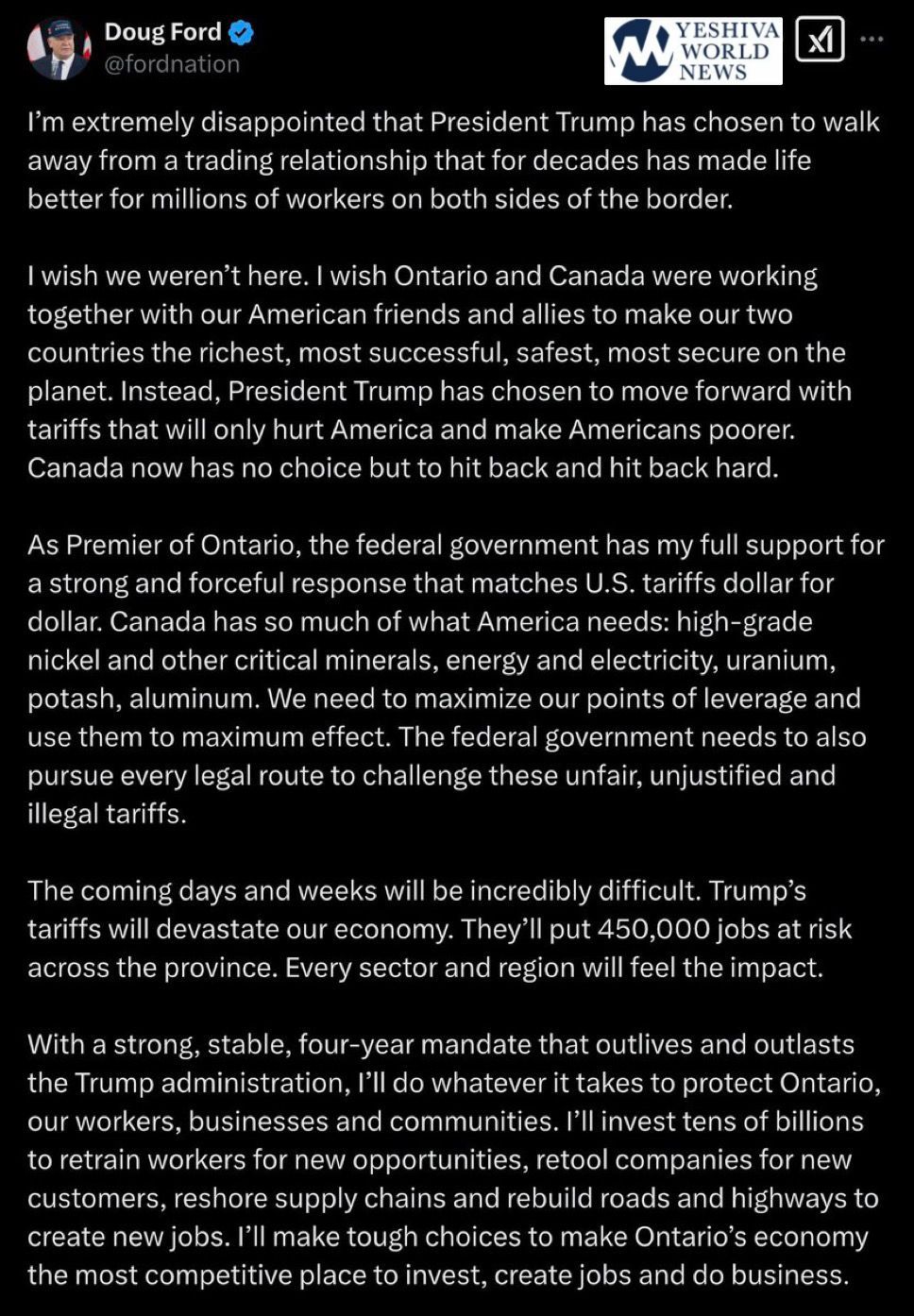 The Ontario Premier claims that Trump’s tariffs will devastate the province’s economy.