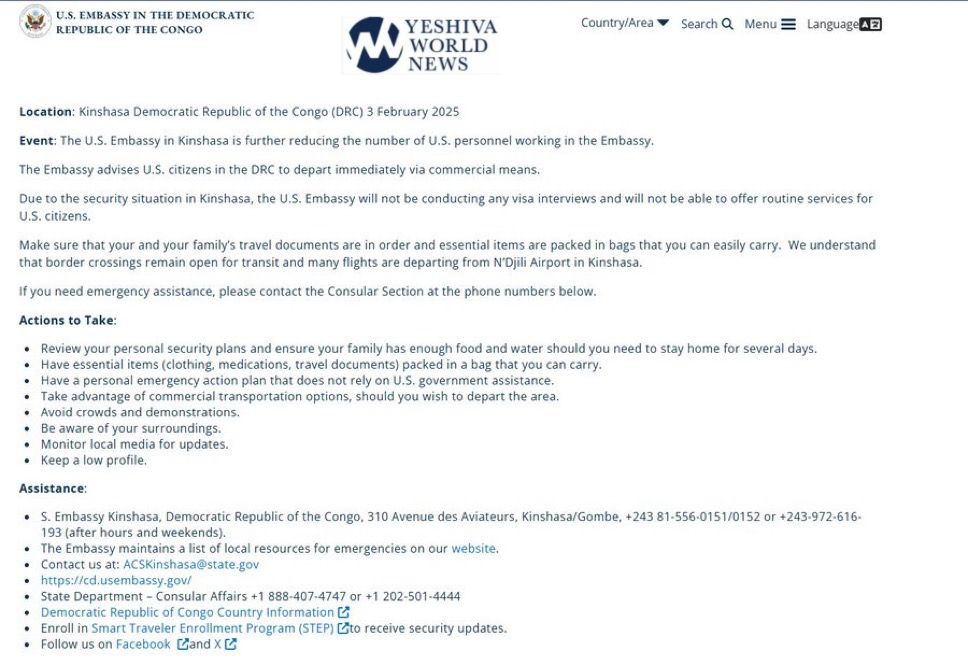 The U.S. Embassy in Kinshasa has urged U.S. citizens in the Democratic Republic of the Congo to depart immediately via commercial means due to the security situation, and has announced that it will not conduct visa interviews or provide routine services for U.S. citizens.