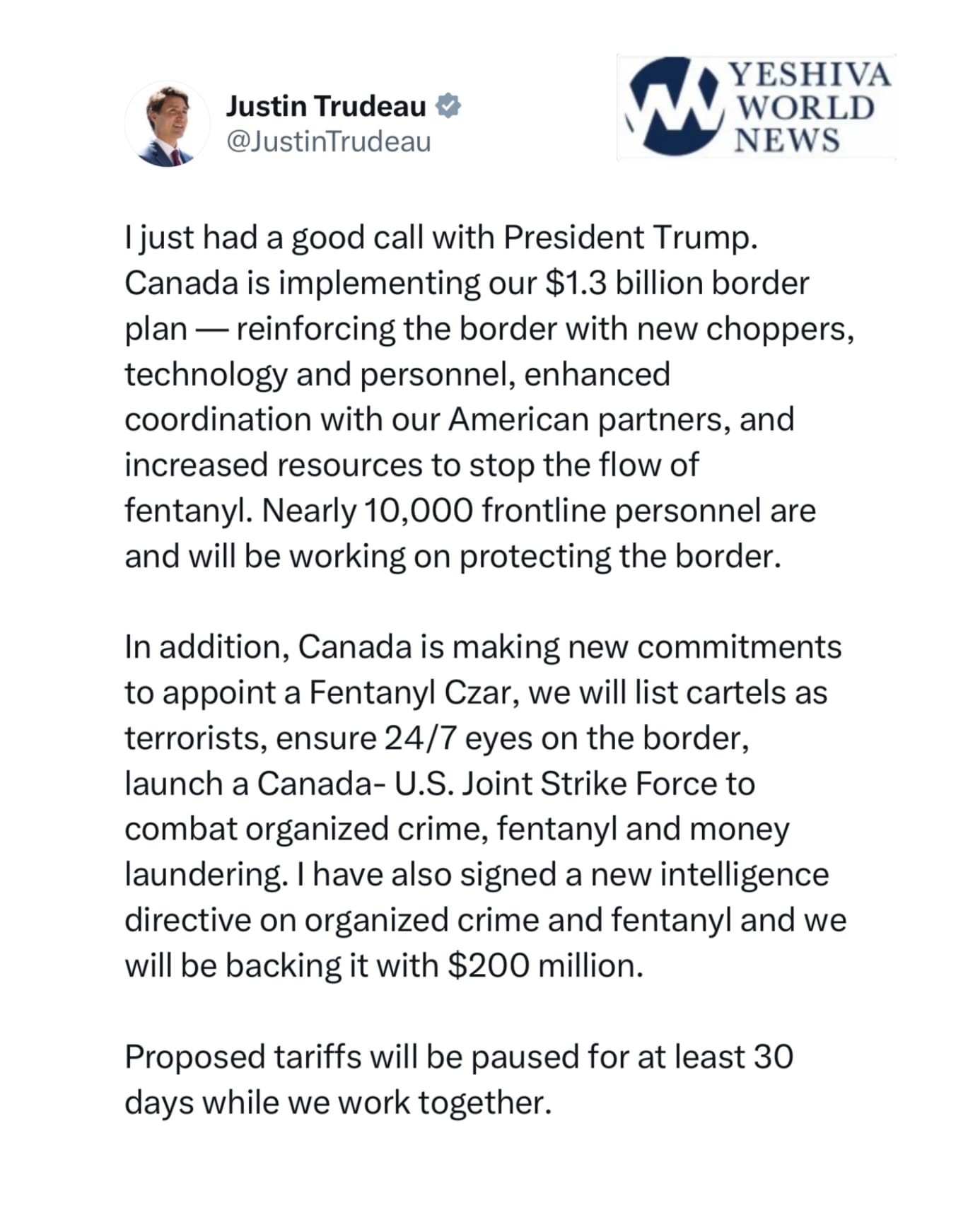 🚨 TRUDEAU FOLDS LIKE A WET PAPER BAG! Canada to implement $1.3 billion border plan, send 10,000 personnel to border, appoint a Fentanyl Czar, launch a Canada-U.S. join strike force, and will pause proposed tariffs.