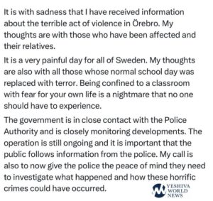 Swedish PM Ulf Hjalmar Kristersson statement on the shooting’s in Örebro, Sweden: