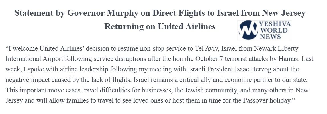Gov. Murphy of New Jersey applauds United Airlines’ choice to resume direct flights from Newark to Tel Aviv, describing Israel as “a vital ally and economic partner” to New Jersey.
