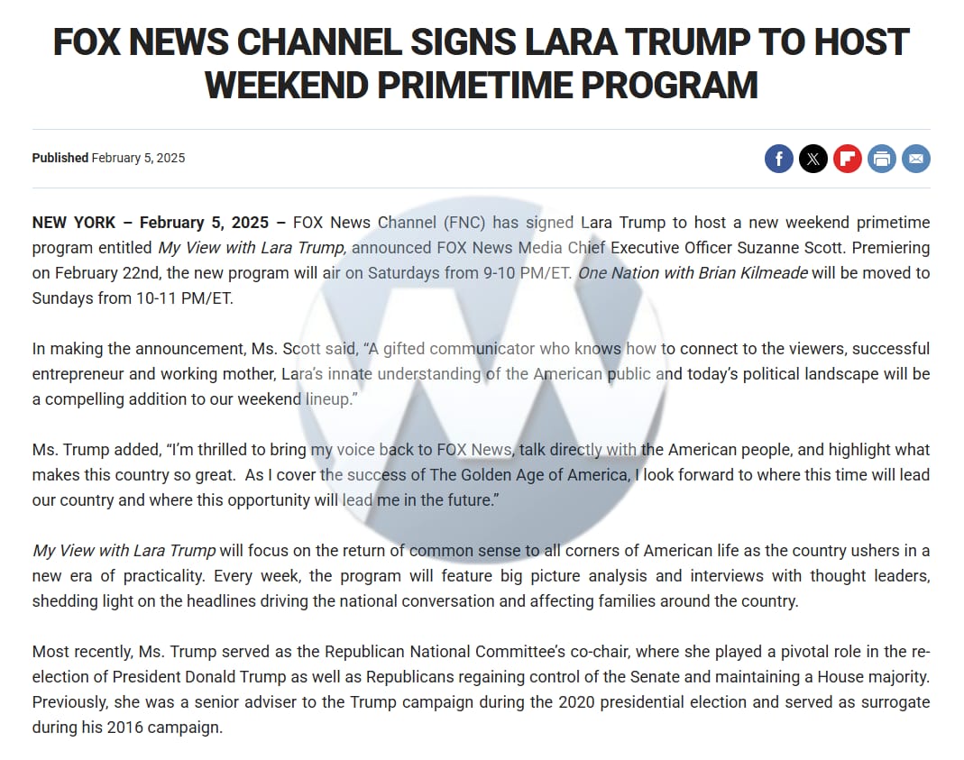 JUST IN: Fox News adds Lara Trump to host weekend show