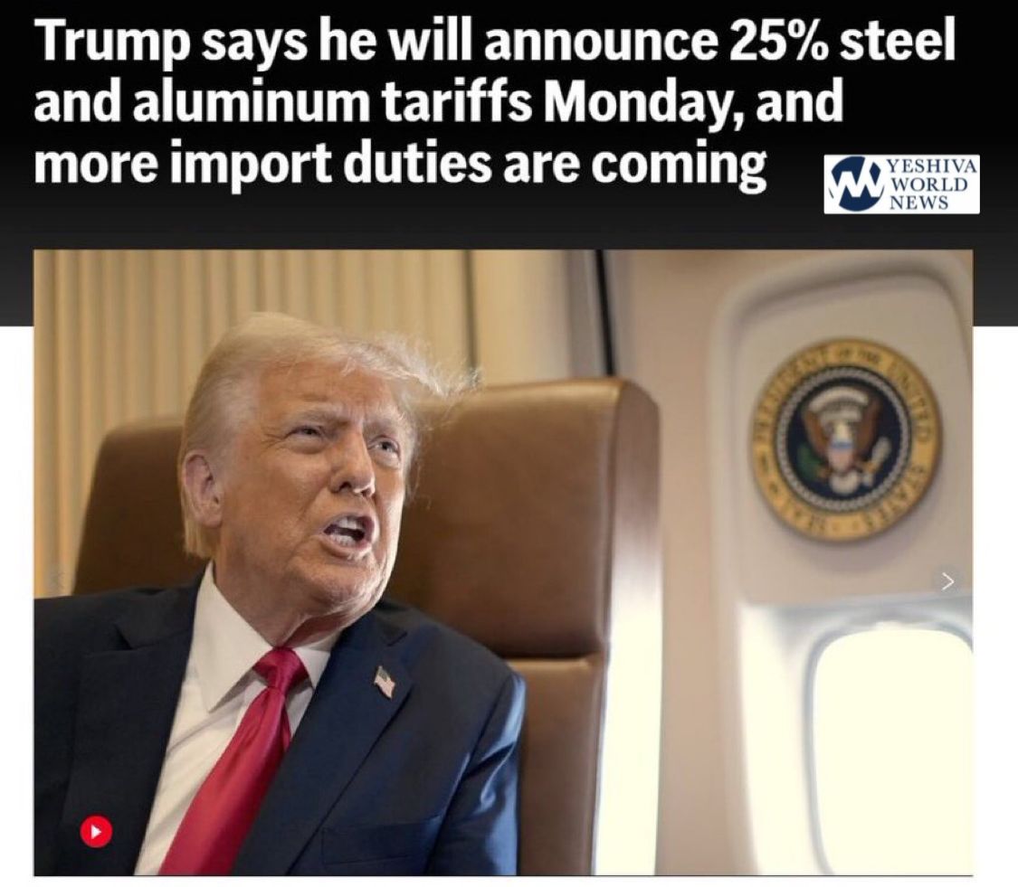 Trump announces he will impose 25% tariffs on steel and aluminum from all countries starting today.