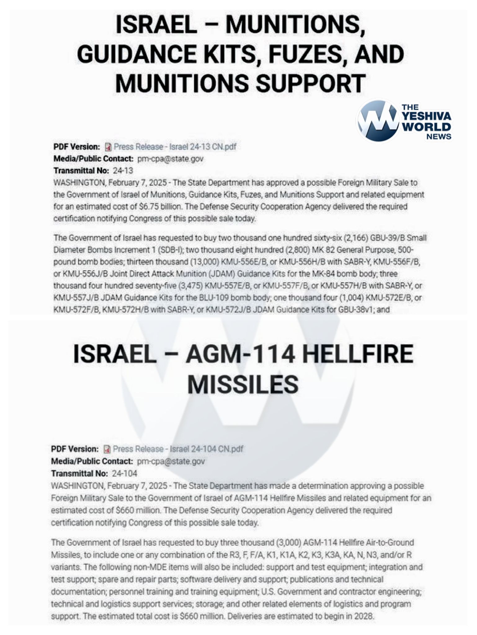 The U.S. State Department has approved a massive arms sale to Israel worth over $7 billion, which includes munitions, guidance kits, fuzes, munitions support equipment, and $600 million in AGM-114 “Hellfire” missiles.