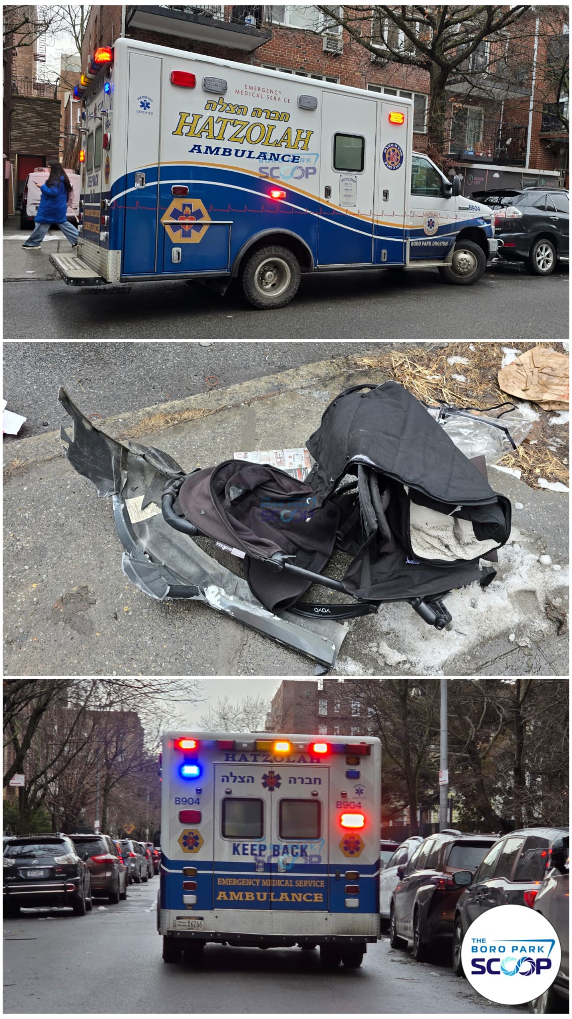 NISSIM IN BORO PARK: A baby in a carriage was struck by a vehicle at 15th Avenue and 55th Street. Boro Park Hatzoloh is on scene, and miraculously, both the mother and baby escaped without life-threatening injuries, despite the carriage being completely crushed