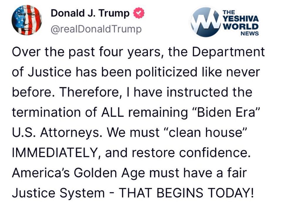 BREAKING: President Trump says he ordered the Justice Department to “clean house” and terminate every single “Biden Era U.S. Attorney”