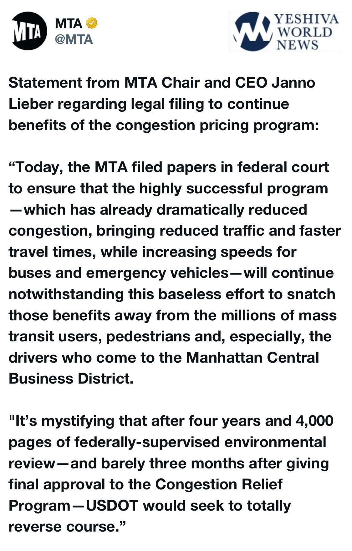 The MTA has initiated legal action to prevent the Trump administration from canceling New York City’s planned congestion pricing toll increase.