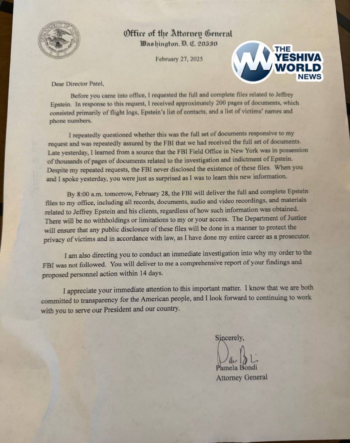 Attorney General Pam Bondi reveals in a letter to FBI Director Kash Patel that the FBI is withholding Epstein documents from her.