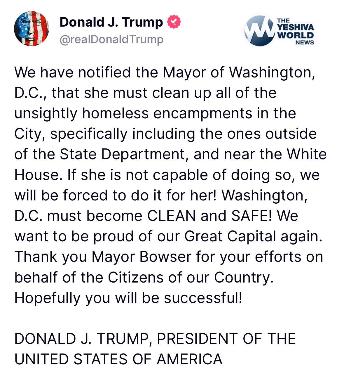 Trump notified DC Mayor that she must clean up all of the ‘unsightly homeless encampments in the City’