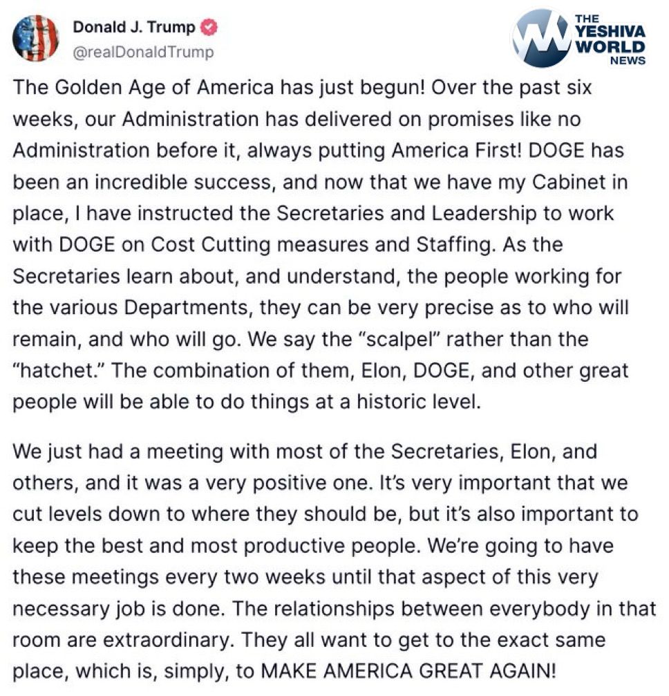 President Trump announces he & his cabinet will be meeting with the DOGE team every two weeks: “It’s also important to keep the best and most productive people. We will have these meetings every 2 weeks until that aspect of this job is done.”