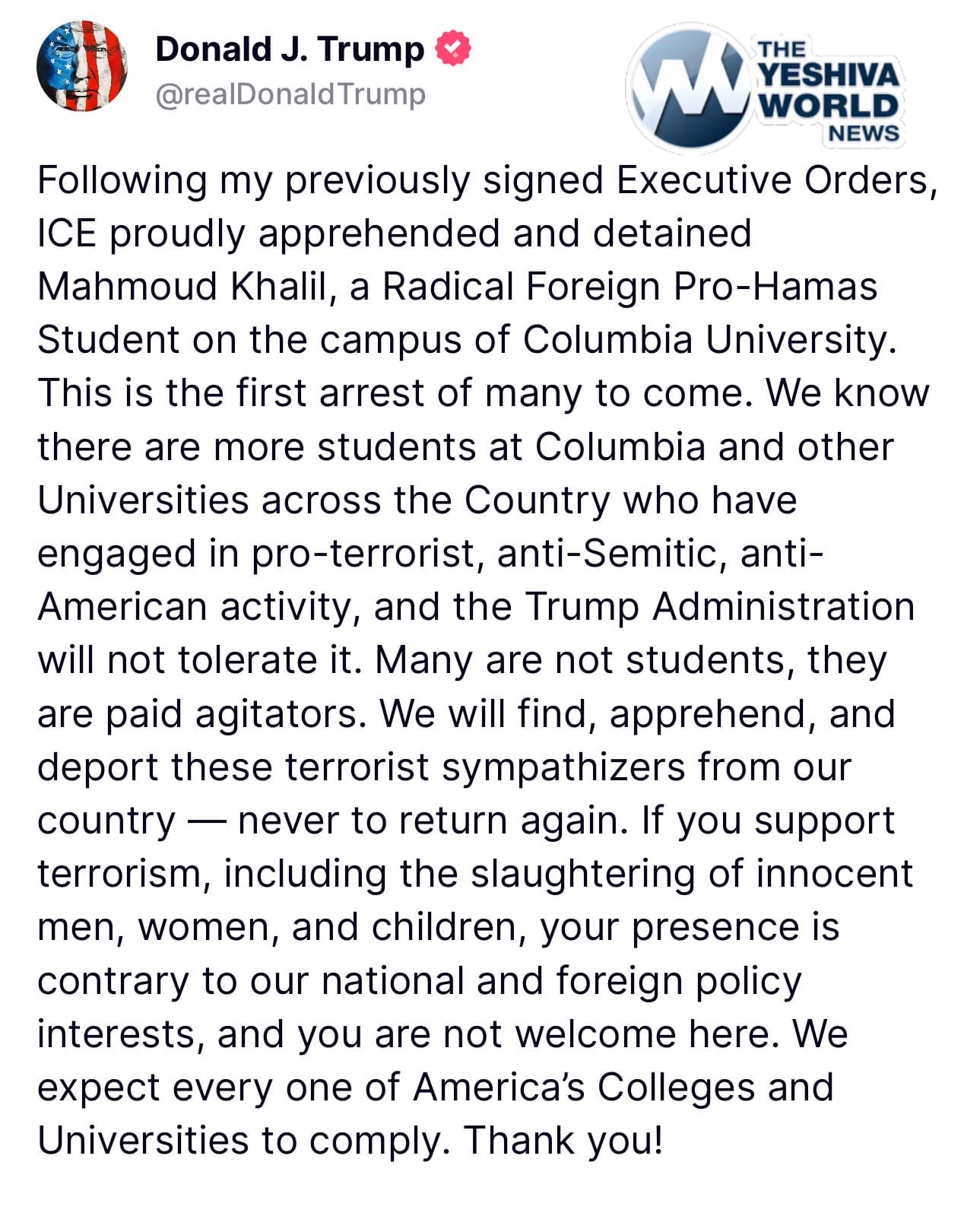 đ¨ Trump announces that ICE agents arrested a pro-Hamas agitator at Columbia. He says that more arrests are coming. “Terrorist sympathizers will be deportedâno exceptions.”