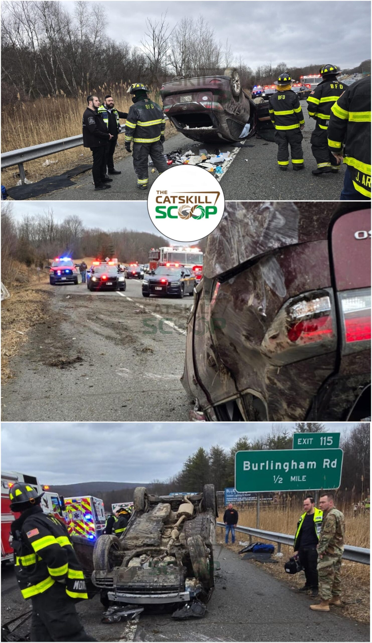 NY-17: Catskills Hatzolah and other emergency personnel were on the scene of an MVA involving an overturned vehicle on Route 17 westbound, between exits 116 and 115. Two individuals sustained injuries and were transported to Orange Regional Medical Center for treatment. (Via Catskills Scoop)