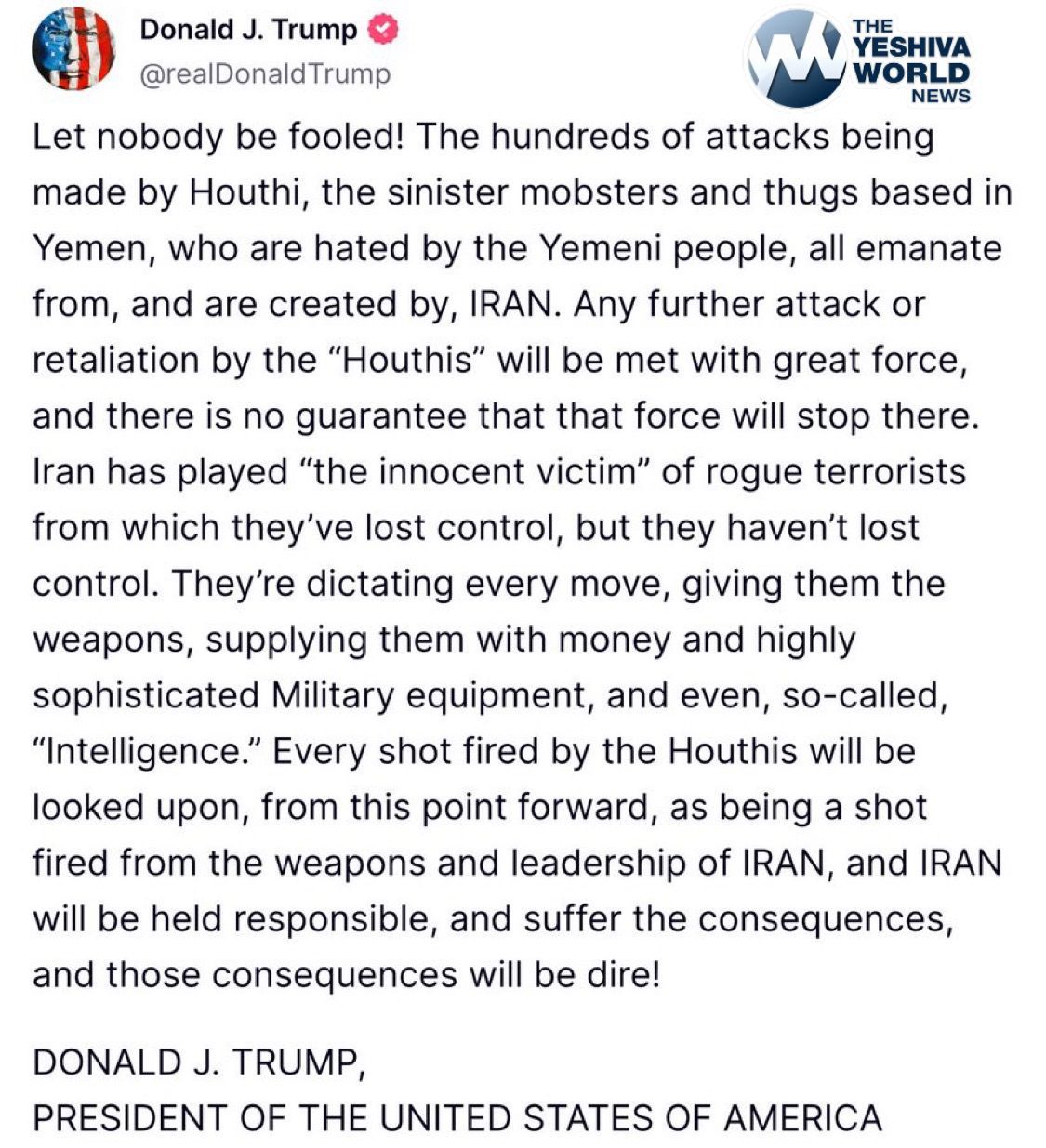 ๐จ BREAKING: PRESIDENT TRUMP SAYS ANY SHOT FIRED BY HOUTHIS WILL BE VIEWED AS FIRED FROM IRAN!