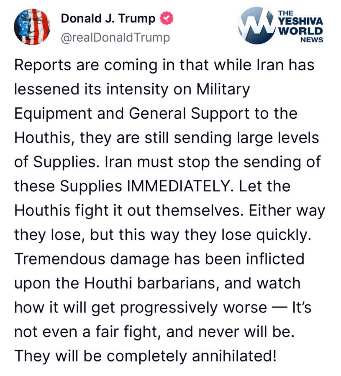 President Trump demands Iran end all weapons shipments to the Houthis, who he says will be “annihilated” for their attacks on global shipping