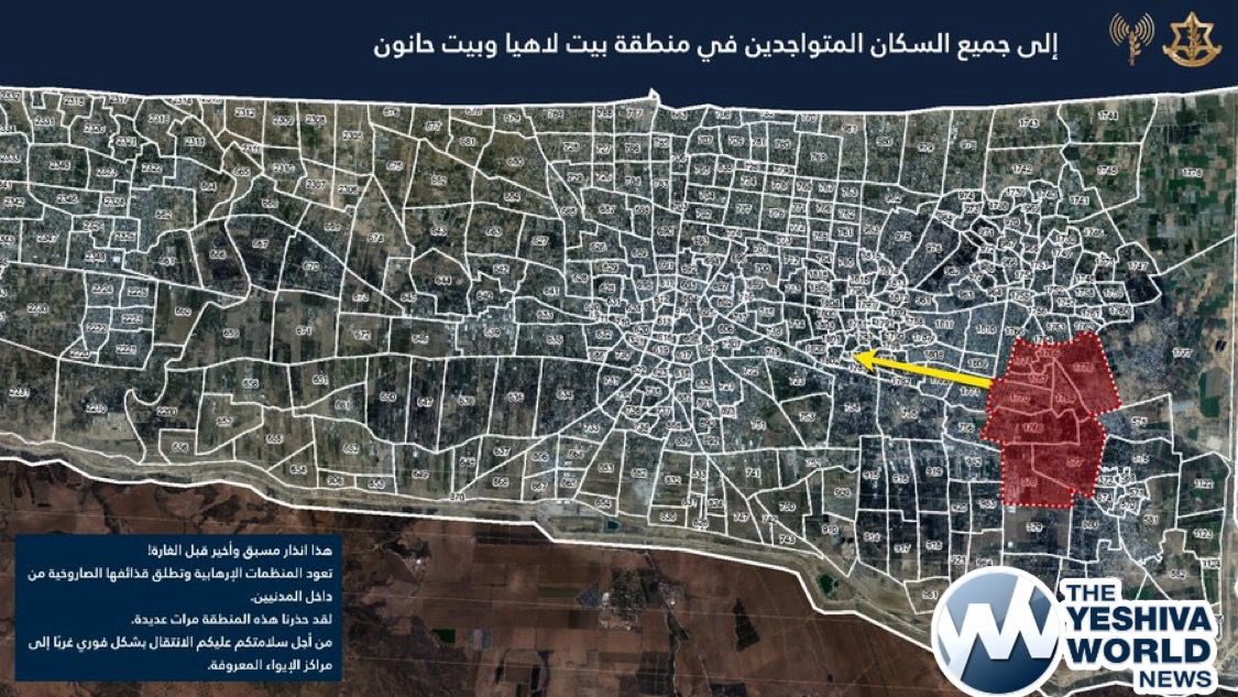 After Palestinian Islamic Jihad fired rockets from northern Gaza at Sderot, the IDF warned Palestinians in Beit Lahiya and Beit Hanoun to evacuate, with spokesman Col. Avichay Adraee posting a map as a “final warning” before strikes.