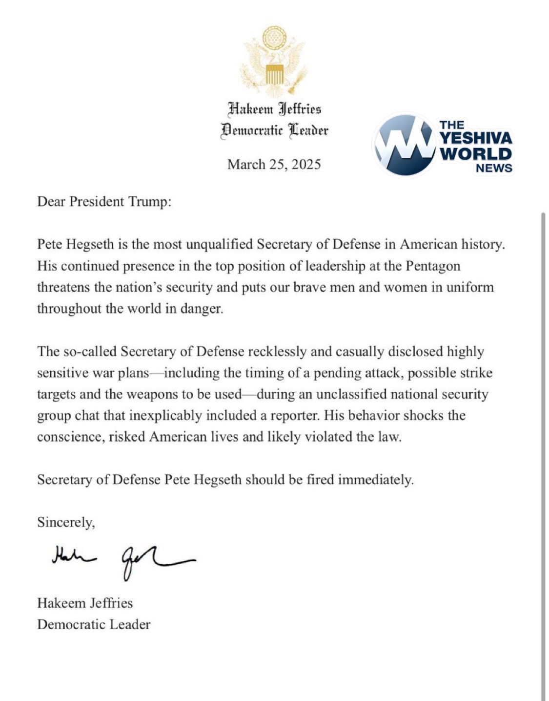BREAKING: Democratic Leader Hakeem Jeffries says U.S. Secretary of Defense Pete Hegseth should be fired immediately.